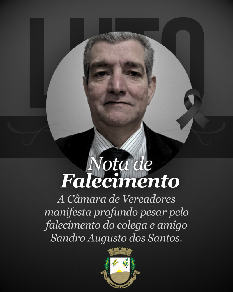 A Câmara de Vereadores de Saldanha Marinho, em nome do Presidente, Vereadores e Funcionários, manifesta profundo pesar pelo falecimento do colega e amigo Vereador Sandro Augusto dos Santos.