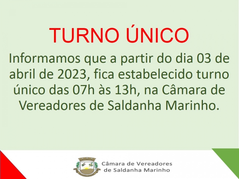 Informamos que a partir do dia 03 de abril de 2023, fica estabelecido turno único das 07h às 13h, na Câmara de Vereadores de Saldanha Marinho.