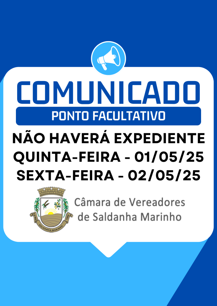 Ponto Facultativo na Câmara de Vereadores, dias 01/05 e 02/05.