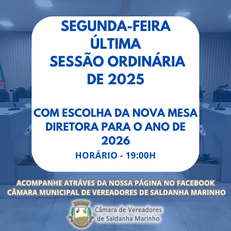 Segunda-feira, 15 de dezembro, teremos a última Sessão Ordinária do ano de 2025, às 19 horas, no Plenário Ver. Ottmar Neuwald.